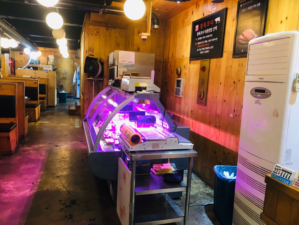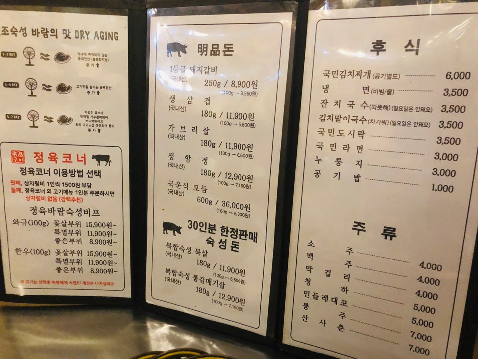 가게 입구에 보면 메뉴판 외 정육코너에 있는 고기를 사 자리에 앉아 구워 먹을 수 있도록 되어있습니다.