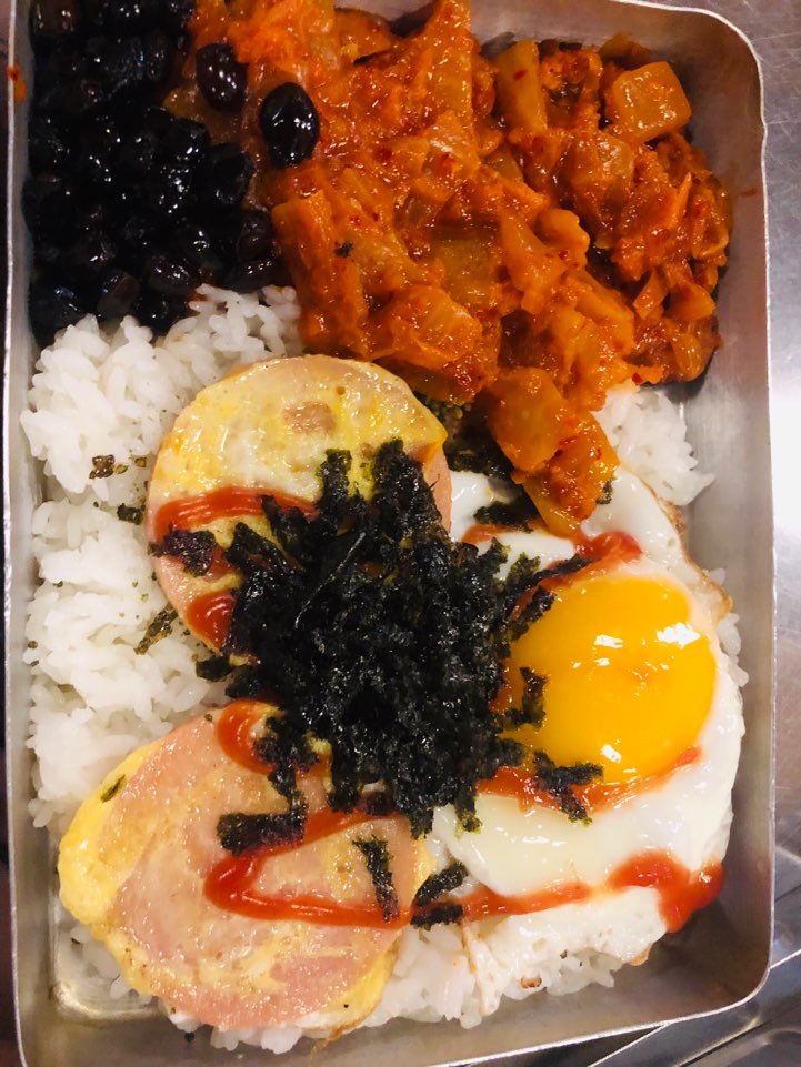 분홍 햄 2개와 계란 반숙 케찹 김가루 볶음김치 콩자반이 있습니다.
