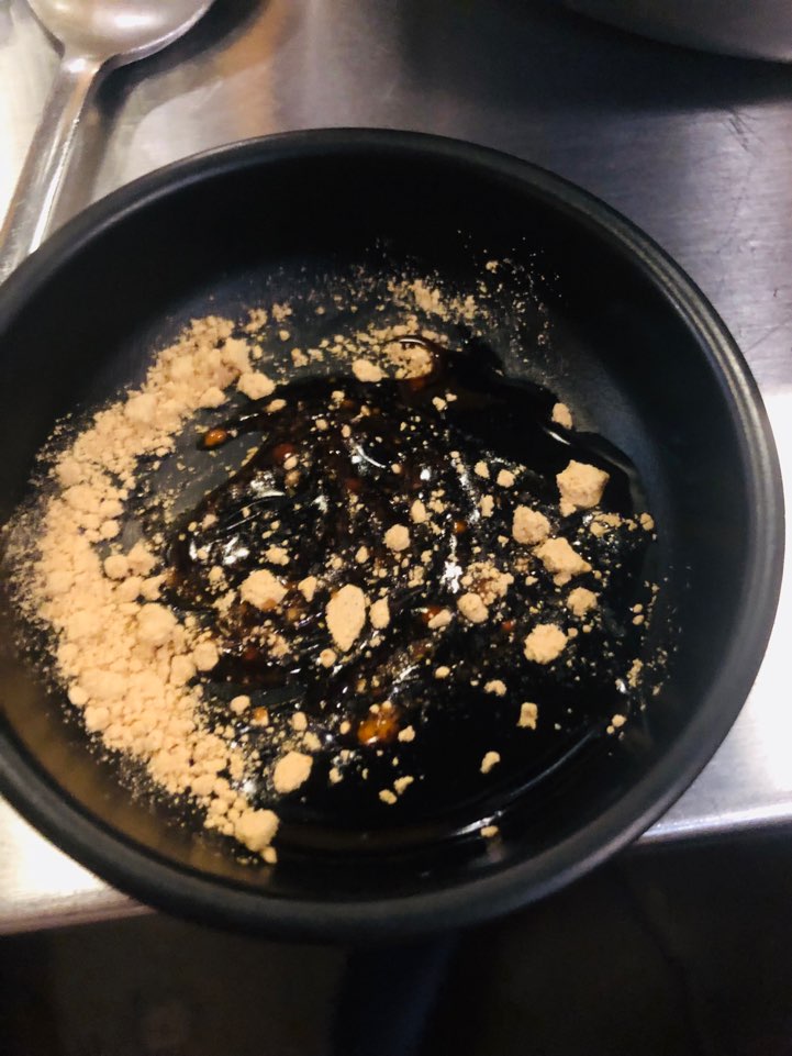 이 소스가 조금 신기했어요. 검은색은 데리야끼 소스 맛이 낫으며 콩가루와 섞어 먹는 것인가 봅니다.